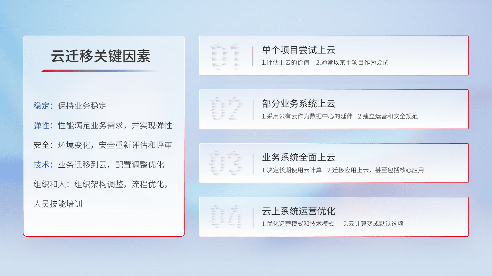 结合实际业务,,,从规划设计、、、云平台选型、、、、云原生改造、、、、数据迁移、、、集成交付,,,迁移全过程为客户识别最佳上云路径,,,,做好风险识别管理,,,,设计网络架构、、、身份权限、、、、安全审计合规、、、、操作审计、、日志审计、、、监控告警策略、、、、多站点容灾设计等,,对云上基础设施进行整体规划,,,,提升IT治理水平,,以满足弹性、、高可用、、、高性能的需求。。