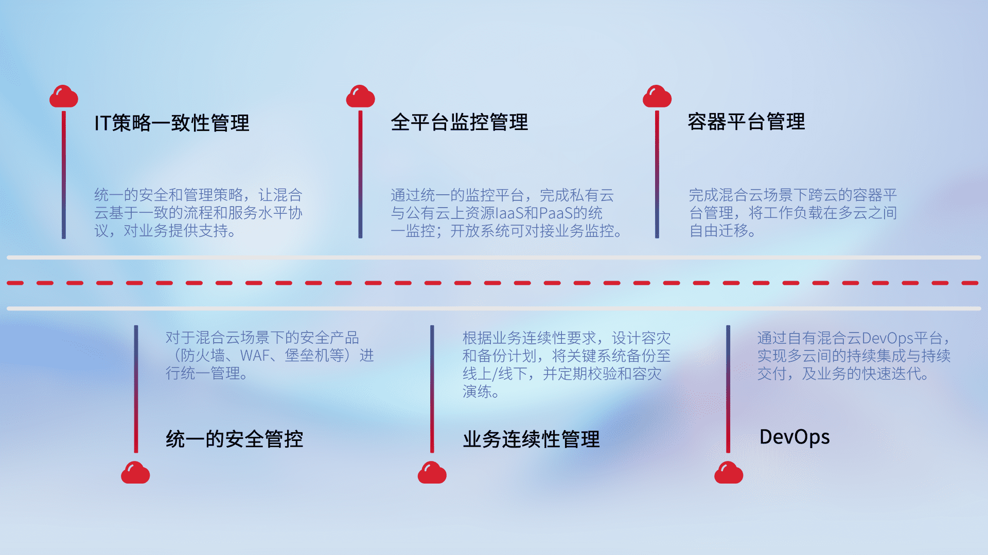 通过多云纳管,,,,以统一的资源数据模型把客户的云资源进行抽象和封装,,,,进而实现对多云资源的统一操作,,,保障云资源管理的可靠性、、、稳定性与可用性。。。量身定制化运维内容,,,,配置、、、、开发运维、、、、补丁管理、、、备份、、监控、、认证和访问管理、、、审计和日常巡检等,,,,保障在用云过程中的可靠度,,稳定度以及高可用率。。